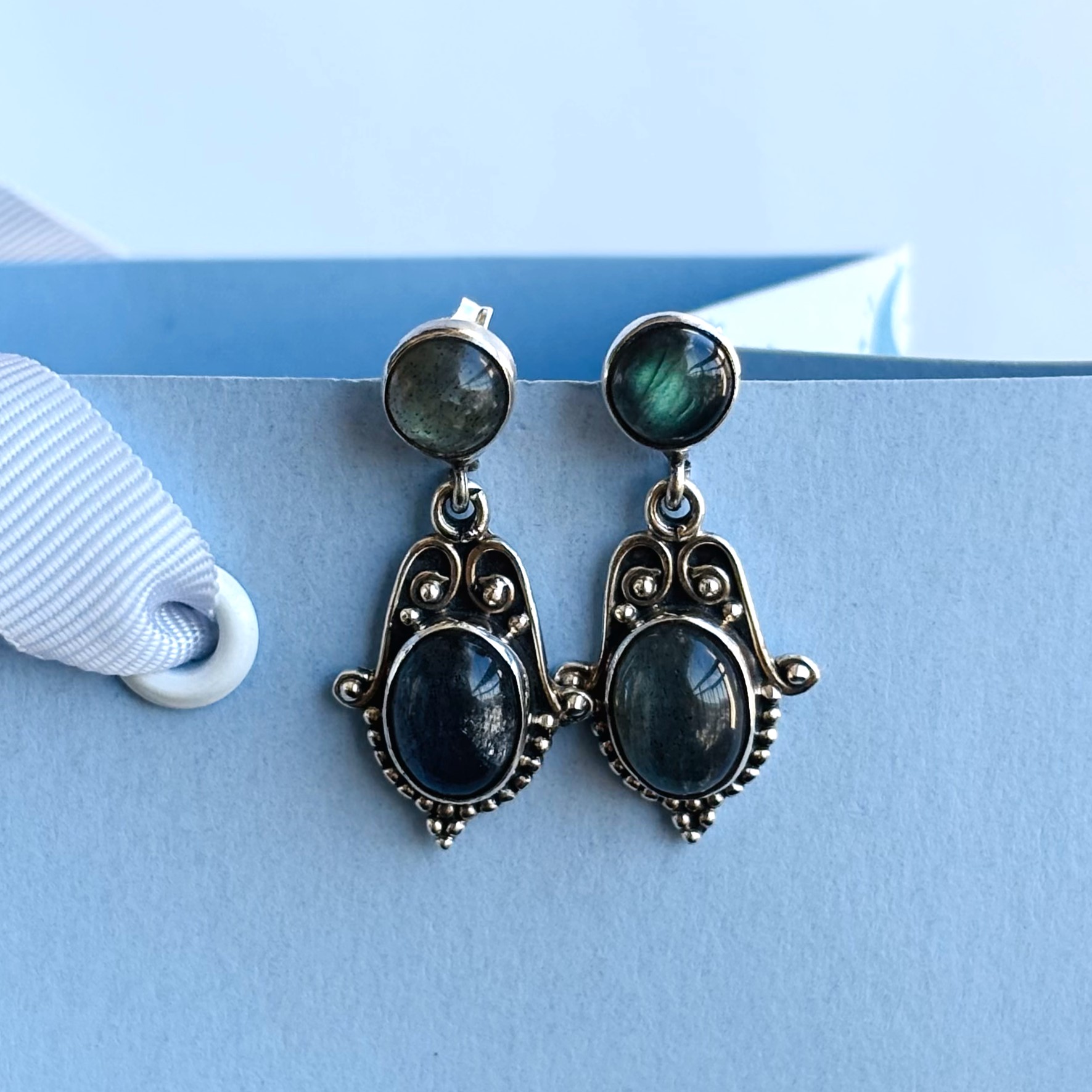 Brinco de pedra natural Labradorita rico em detalhes arabesco Bali na prata 925 com tarraxa, encanto e sofisticação em uma única peça.