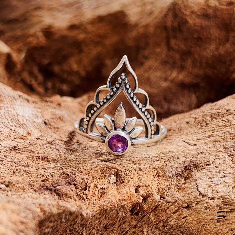 Anel detalhes arabesco com pedra Ametista.
