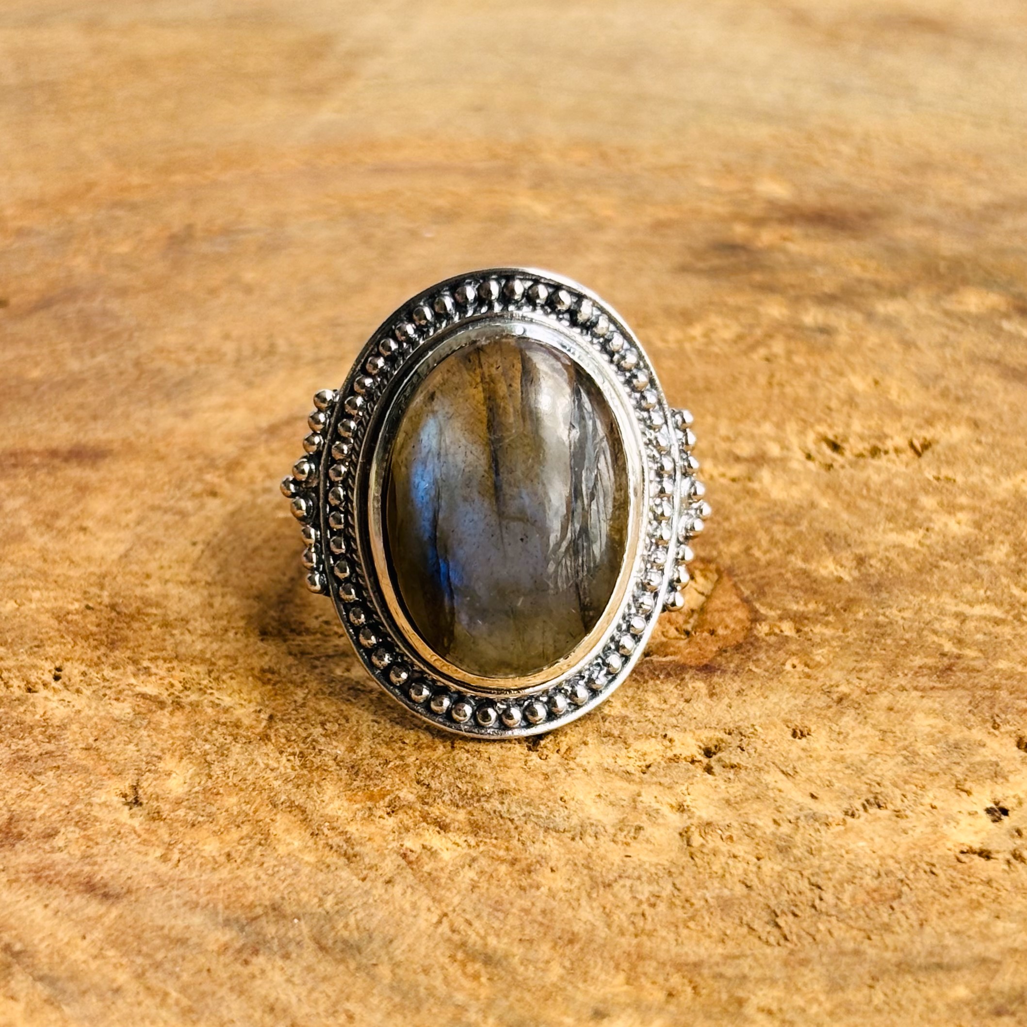 Lindo anel de prata 925 com pedra natural grande em Labradorita oval média, rico em detalhes, esse anel vai fazer você se apaixonar pela sua beleza e encanto.